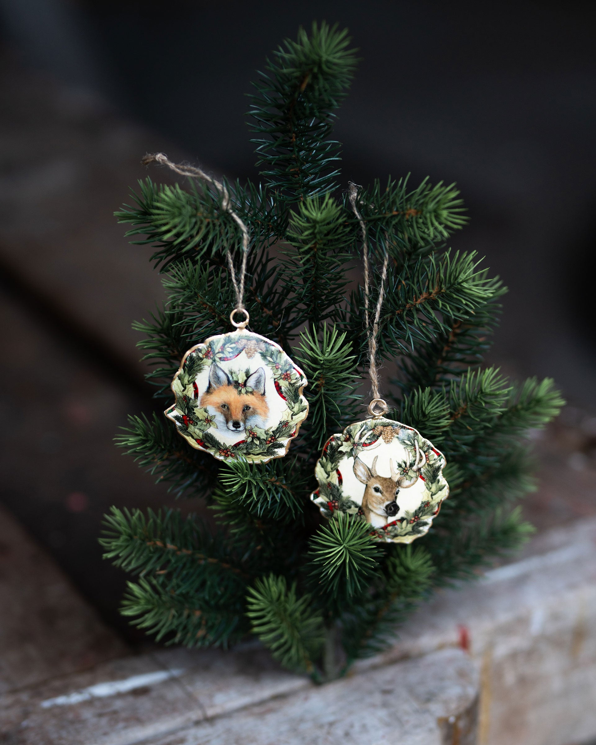 Julgranen får en lekfull touch med dessa hängande dekorationer med en hjort och en räv. Tillverkade av metall.
