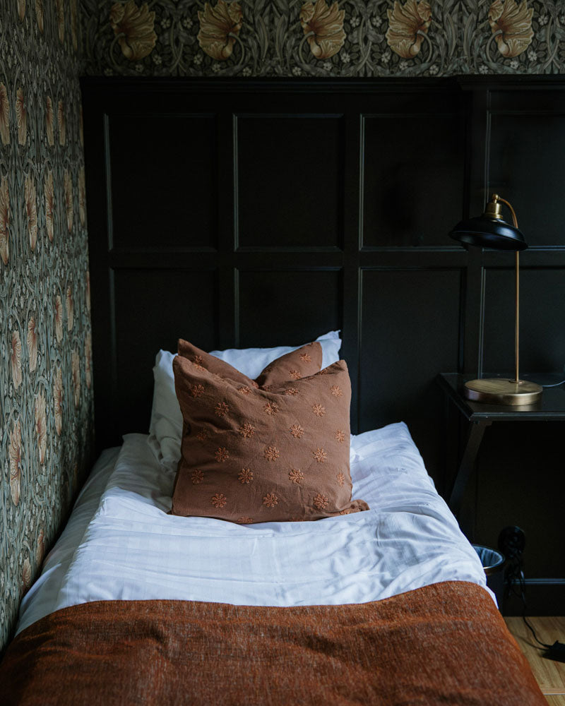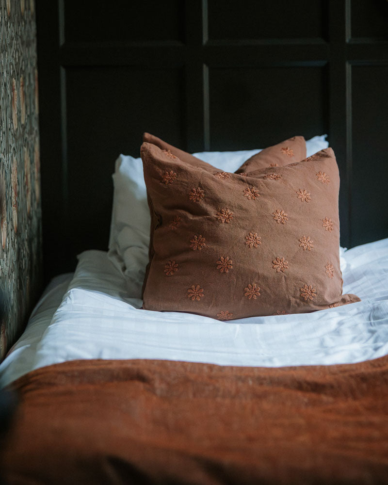 Superfint kuddfodral med broderade blad. Tillverkat av bomull.