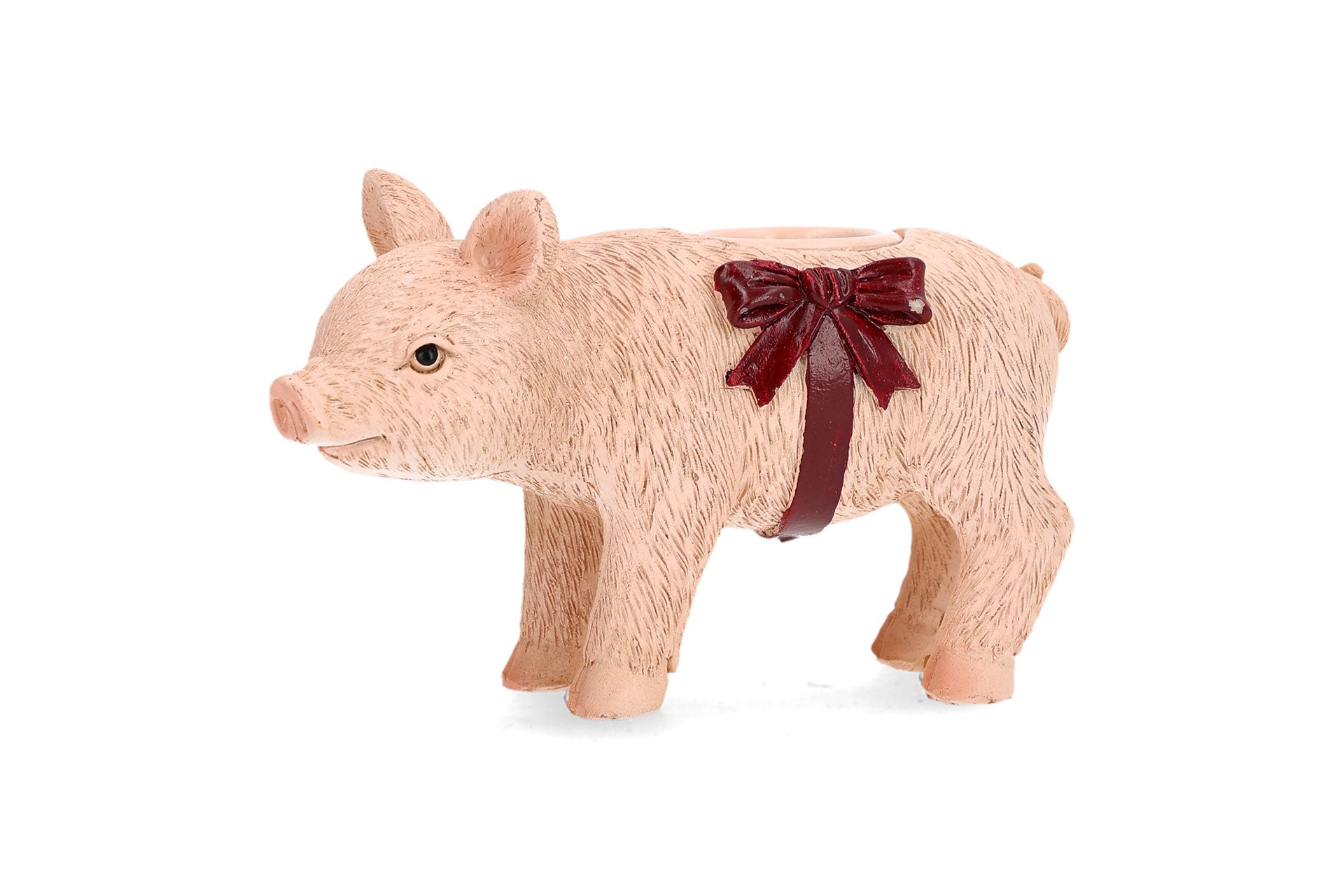 Charmig liten ljusstake i form av en söt gris. Grisen har en röd rosett som en fin detalj. Passar för kronljus.