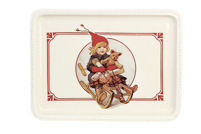 Rektangulär bricka med beige bottenfärg och ett charmigt julmotiv föreställande en flicka på kälke. Motivet är skapat av Jenny Nyström, en av Sveriges mest älskade illustratörer, känd för sina klassiska jultomtar och stämningsfulla vinterbilder som präglat den svenska jultraditionen sedan slutet av 1800-talet.