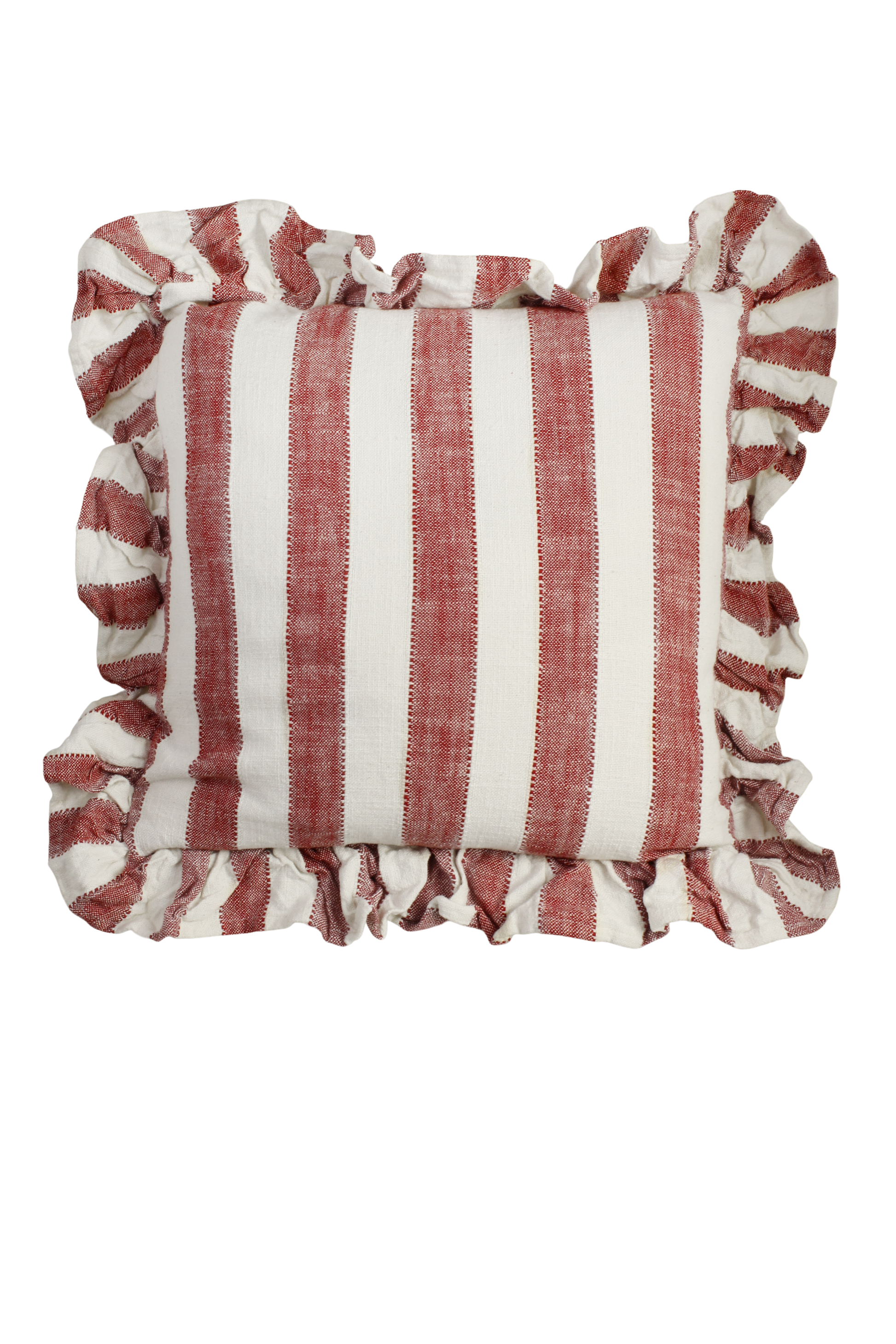 Kuddfodral i 100% ekologisk bomull med klassiskt rödrandigt mönster och en vacker volang. Dold dragkedja på baksidan. Fin att matcha med andra produkter i samma serie.