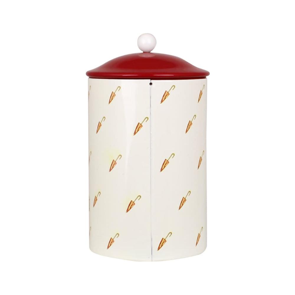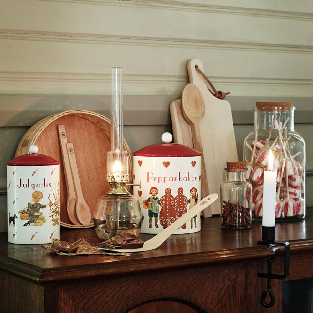 Plåtburk med nostalgiskt julmotiv för julgodis. Lock i rött med en rund knopp. Silikonring som gör att locket sitter stadigt och sluter tätt.