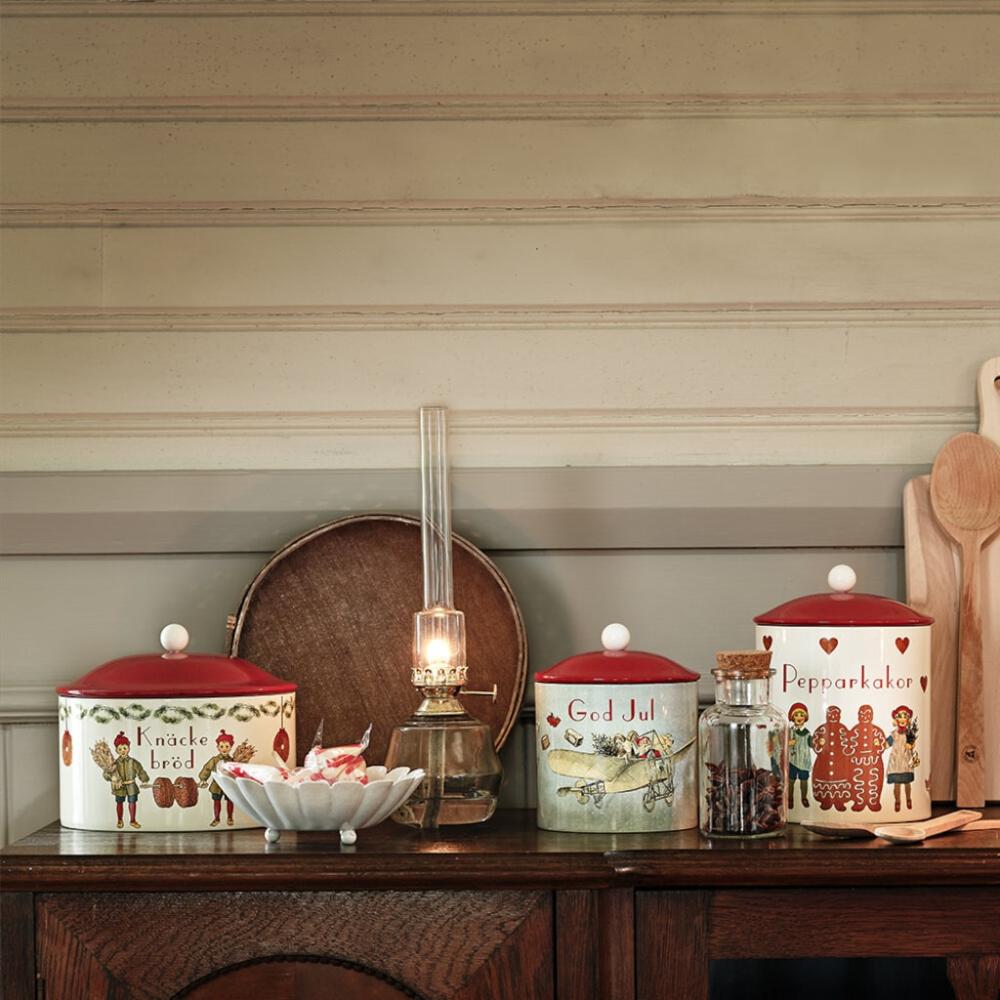Plåtburk med nostalgiskt julmotiv för pepparkakor. Lock i rött med en rund knopp. Silikonring som gör att locket sitter stadigt och sluter tätt. Fin att sätta fram på julbordet!