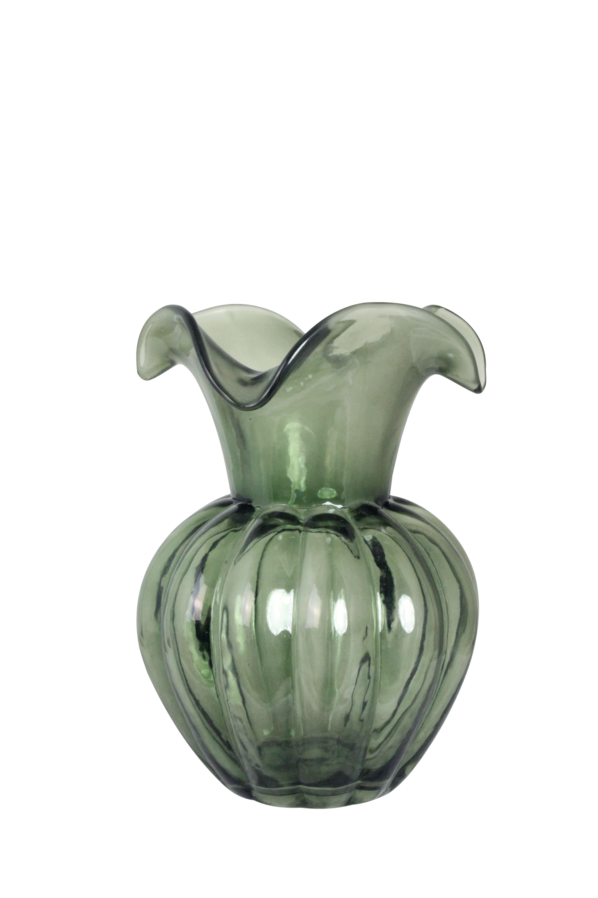 Elegant vas i grönt med mjukt vågiga kanter. Med sin djupa gröna färg ger den en varm och mysig atmosfär till alla utrymmen. OBS! Ej diskmaskinssäker.